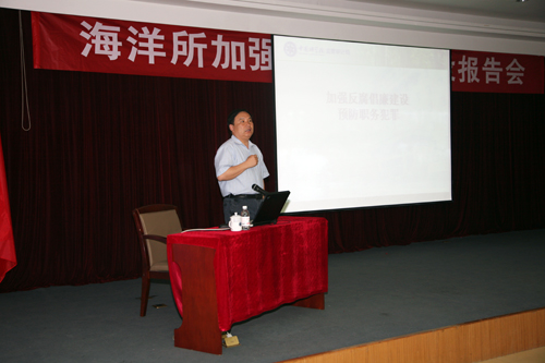 5月21日,為進(jìn)一步加強(qiáng)反腐倡廉建設(shè),規(guī)范各類人員職務(wù)行為,中國科學(xué)院海洋研究所舉行“反腐倡廉建設(shè)專題報(bào)告會(huì)”,特邀中國科學(xué)院監(jiān)察審計(jì)局副局長郭建軍作了題為“加強(qiáng)反腐倡廉建設(shè),預(yù)防職務(wù)犯罪”的主題報(bào)告。全所副研究員以上人員,各類項(xiàng)目課題組長及相關(guān)人員,機(jī)關(guān)各部門全體人員等近200人參加了報(bào)告會(huì)。黨委書記啟堯主持了報(bào)告會(huì)。