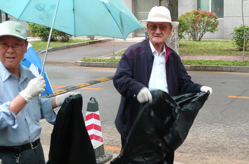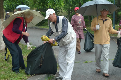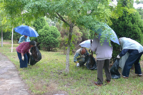 6月5日上午9:00,天空下著毛毛細(xì)雨, 60余位離退休職工志愿者提前來(lái)到離退辦門(mén)前,大家?guī)讉€(gè)人組成一小組,手提垃圾袋,沿著金屬所南圍墻,將李薰樓和工藝樓南側(cè)花園里的石塊、塑料、干樹(shù)枝等垃圾撿拾起來(lái)。一個(gè)多小時(shí)的勞動(dòng)結(jié)束了,大家手中的垃圾袋都裝的滿滿的、重重的,每個(gè)人的臉上都掛滿了汗水、雨水和開(kāi)心的笑容。