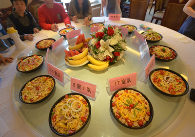 本次活動分為PIZZA制作和水果拼盤兩個環(huán)節(jié)。在PIZZA制作過程中,必勝客的pizza培訓(xùn)師現(xiàn)場詳細講解了制作過程。然后大家用統(tǒng)一分發(fā)的面餅及各組所要求的食材,精心設(shè)計制作出了自己的pizza。大家就各自pizza的設(shè)計寓意向評委老師做了講解,隨后經(jīng)過20分鐘的烘烤,香噴噴的pizza出爐,評委老師進行逐一品嘗后打分。在水果拼盤環(huán)節(jié),大家用西瓜、香蕉、芒果等水果,通過精心的設(shè)計,或是雕琢成小動物樣、或是拼合為齊心合力狀,各形各狀,無不體現(xiàn)著參賽者絕佳的創(chuàng)造力和想象力。與PIZZA制作和水果拼盤同時進行的還有經(jīng)典的包粽子活動,讓大家親身體驗了包粽子的樂趣。同時,還有蘋果樂園、快手剝花生等小游戲也得到了大家的積極參與。