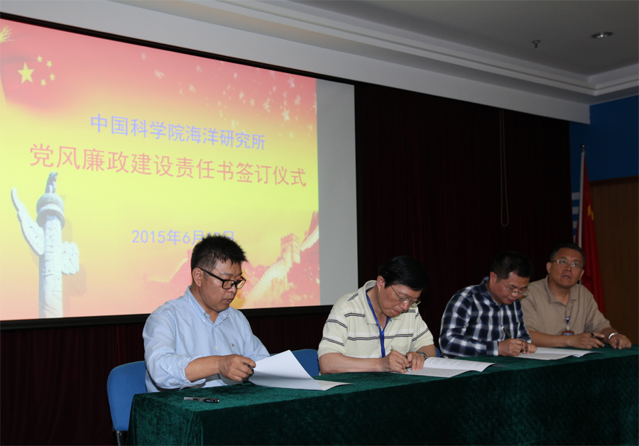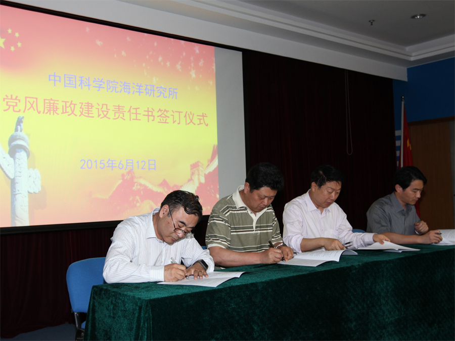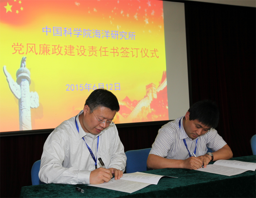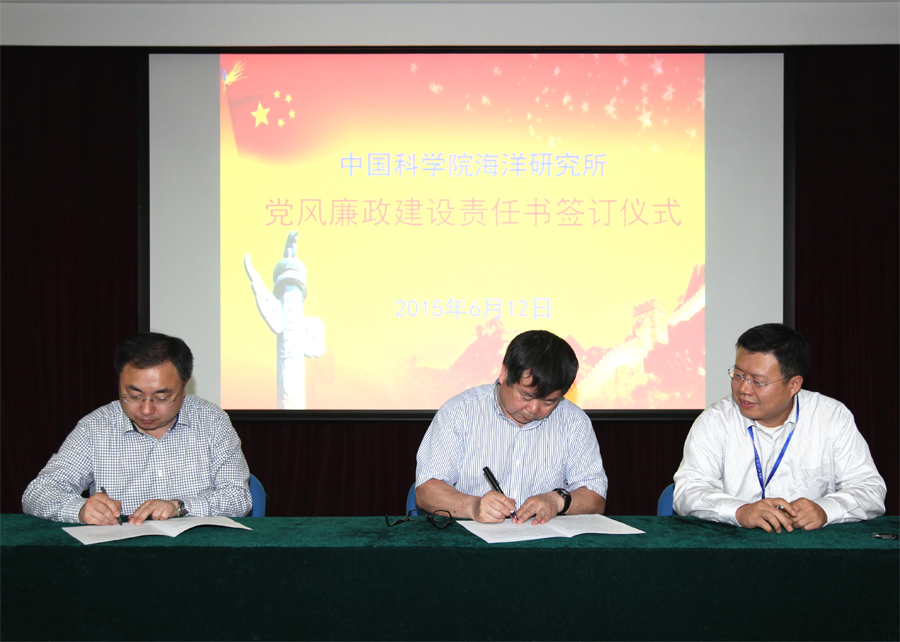6月12日上午,海洋研究所舉行了黨風廉政建設責任書簽訂儀式。所長孫松;黨委書記兼副所長王凡;副所長李鐵剛;黨委副書記、副所長兼紀委書記楊紅生;副所長王輝出席儀式。所長助理、黨委委員、紀委委員、研究室正副主任、管理和支撐體系負責人共50余人參加了簽字儀式。儀式由紀委書記楊紅生主持。