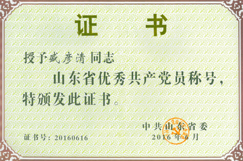 2016年6月30日,山東省慶祝中國(guó)共產(chǎn)黨成立95周年大會(huì)在濟(jì)南舉行。大會(huì)表彰了200名“山東省優(yōu)秀共產(chǎn)黨員”,100名“山東省優(yōu)秀黨務(wù)工作者”,199個(gè)“山東省先進(jìn)基層黨組織”。中國(guó)科學(xué)院煙臺(tái)海岸帶研究所研究員盛彥清同志獲得“山東省優(yōu)秀共產(chǎn)黨員”稱(chēng)號(hào)。煙臺(tái)市有“山東省優(yōu)秀共產(chǎn)黨員”17人,盛彥清同志與獲獎(jiǎng)人員一起到濟(jì)南參加了表彰大會(huì)。