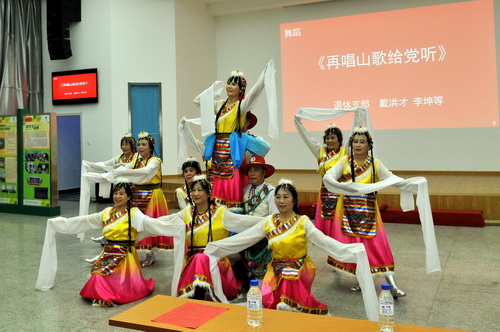 在農(nóng)業(yè)支部的朱雪峰獨唱《天耀中華》之后,環(huán)境支部和信息編輯開發(fā)支部合唱了《中國,中國,鮮紅的太陽永不落》和《歌唱祖國》。離退休支部的老黨員穿起藏族的傳統(tǒng)服裝,甩起長袖,帶來了舞蹈《再唱山歌給黨聽》。 最后,研究生總支表演了大合唱《共筑中國夢》,給整場文藝匯演畫上了完美的句號。