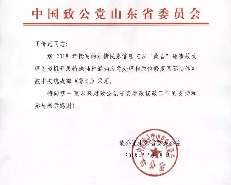 王傳遠副研究員充分立足本職工作,積極履行參政職能,為經濟社會發(fā)展建言獻策。多年來,結合專業(yè)方向,王傳遠副研究員重點針對生態(tài)環(huán)境保護提出有價值的意見建議,多項建議被全國政協(xié)和山東省政協(xié)采用。本次建議也是自2014年來,致公黨煙臺市委第二次有建議被《零訊》采用,得到致公黨山東省委辦公室的認可和感謝。