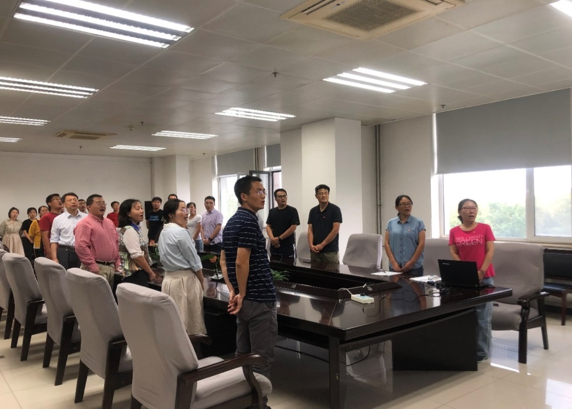 本次活動在全體人員嘹亮的國歌聲中開始,呂劍對本次活動的組織背景做了簡單介紹,并號召支部黨員同志弘揚愛國奮斗精神,堅守“創(chuàng)新科技、報國為民”初心開展科研工作。隨后,全體成員觀看了彩色影像資料《開國大典》,并合唱了《歌唱祖國》、《沒有共產黨就沒有新中國》和《我和我的祖國》三首歌曲,用歌聲表達了科研工作者對祖國的熱愛之情。
