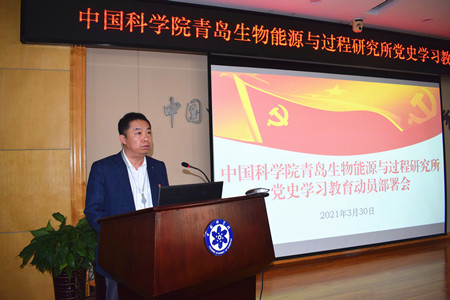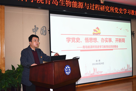 黨委書記、所黨史學(xué)習(xí)教育領(lǐng)導(dǎo)小組組長彭輝做了題為《學(xué)黨史、悟思想、辦實事、開新局》的報告,從黨中央關(guān)于開展黨史學(xué)習(xí)教育的重大決策、院黨組關(guān)于開展黨史學(xué)習(xí)教育的工作部署、青島能源所黨史學(xué)習(xí)教育工作安排三個方面做了動員部署。
