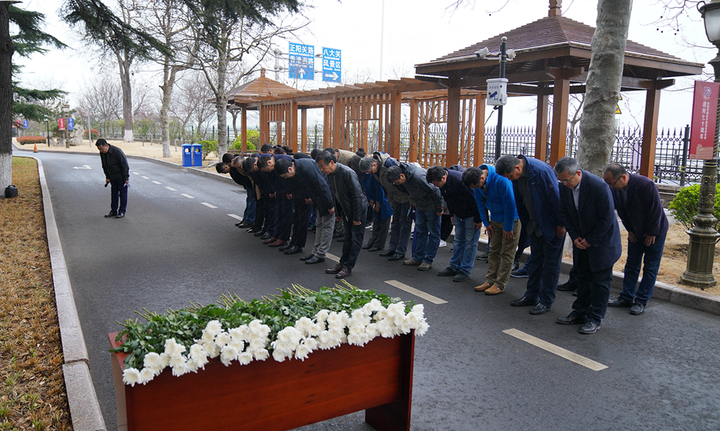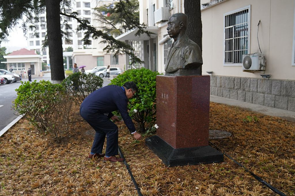 大家在童第周、曾呈奎兩位科研先驅(qū)銅像前靜默鞠躬,并依次上前敬獻鮮花,表達對先輩的緬懷與敬重。
