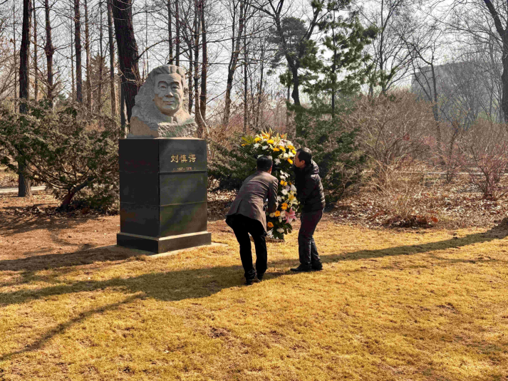 黨委書記、副所長(zhǎng)金昌杰和標(biāo)本館館長(zhǎng)袁海生研究員向劉慎諤先生雕像敬獻(xiàn)花籃