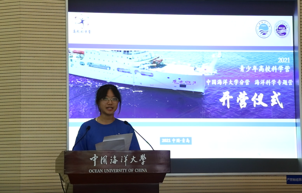 來自山東省威海市實(shí)驗(yàn)高級中學(xué)的宮儼凌同學(xué)作為營員代表發(fā)言。她在發(fā)言中表達(dá)了對活動組織方的衷心感謝,表示期待通過此次科學(xué)營更好地了解大學(xué)歷史文化,知曉前沿海洋科技,鍛煉實(shí)踐能力。