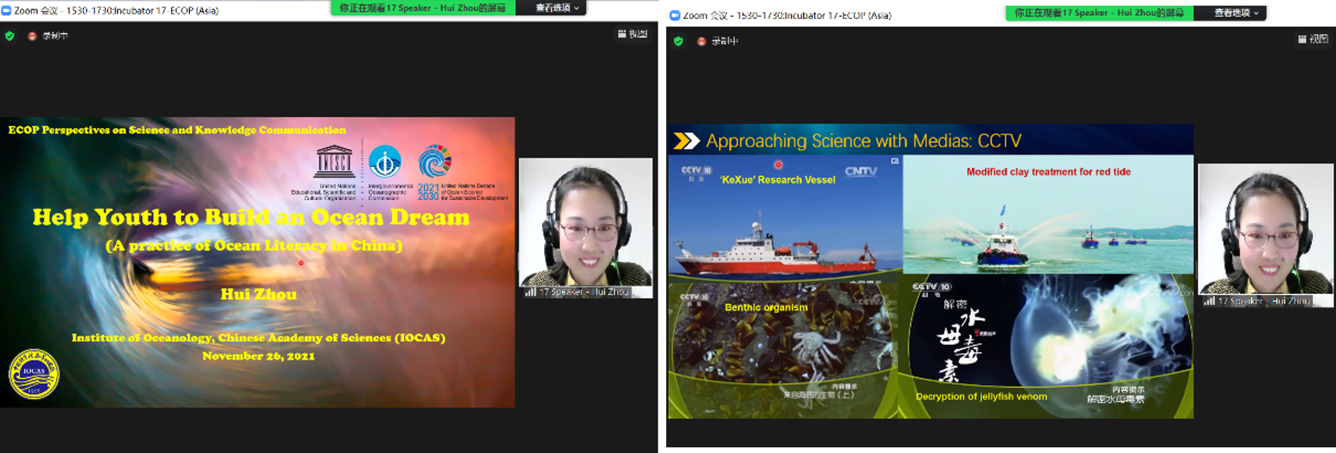 在會上,周慧博士代表海洋所作了題為“幫助青年一代構(gòu)筑海洋夢” (Help Youth to Build an Ocean Dream)的報(bào)告。周慧博士詳細(xì)介紹了海洋所多元化、創(chuàng)新性的海洋科普工作及豐富的海洋科普教育資源,并結(jié)合自身在科普工作中的實(shí)踐、感悟,向與會者展示了海洋所近些年在海洋科普工作中取得的工作成果,傳遞了海洋所致力于高端科研資源科普化宗旨和海洋科普國際化的理念,得到了與會者的一致認(rèn)可,期待海洋所將來能為聯(lián)合國“海洋十年”未來海洋人才儲備和強(qiáng)化大眾海洋意識作出積極貢獻(xiàn)。海洋所王琳博士作為ECOP亞洲工作組的核心成員,在會上探討了該工作組面臨的機(jī)遇和挑戰(zhàn)。