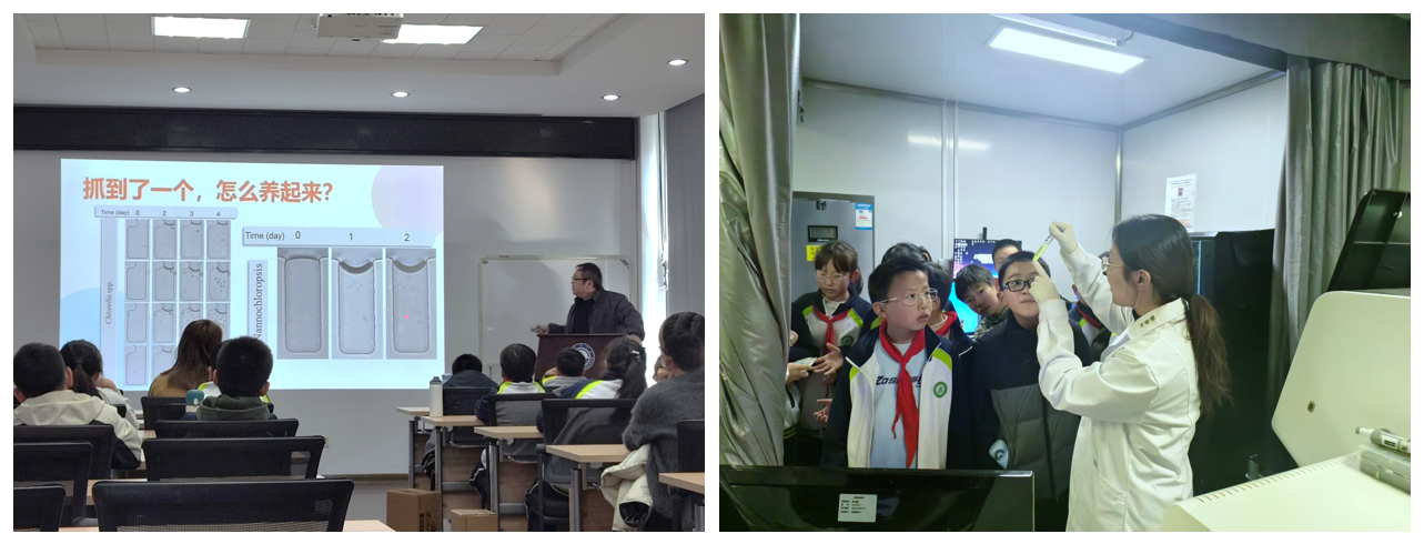 理論學(xué)習(xí)結(jié)束后,在孫魯陽與博士研究生張艷美的帶領(lǐng)下,同學(xué)們走進(jìn)單細(xì)胞中心實驗室,開啟沉浸式實踐體驗。在科研人員的專業(yè)指導(dǎo)下,大家親手調(diào)試顯微鏡,仔細(xì)觀察微藻細(xì)胞的形態(tài)與運動;通過操作實驗設(shè)備,近距離感受光操縱細(xì)胞技術(shù)如何“指揮”細(xì)胞移動——原本只存在于課本中的抽象“細(xì)胞”,此刻變得可看、可觸、可操控。每一次規(guī)范的操作、每一個清晰的觀察結(jié)果,都讓同學(xué)們對細(xì)胞知識有了更直觀深刻的認(rèn)知,也讓他們真切體會到科研工作“嚴(yán)謹(jǐn)中藏著樂趣、探索中滿是驚喜”的獨特魅力,更對青島能源所的科研環(huán)境與創(chuàng)新氛圍產(chǎn)生了強(qiáng)烈興趣。