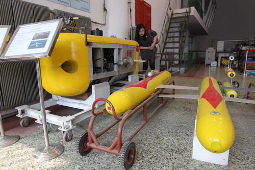 中科院自動(dòng)化研究所“水環(huán)境實(shí)驗(yàn)室”里,18日將在實(shí)驗(yàn)室為市民開(kāi)放表演的水下滑行機(jī)器人?!?/P>