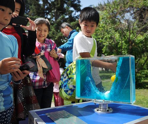 5月17日,小學(xué)生在沈陽應(yīng)用生態(tài)研究所參觀慣性離心力裝置展示。 為配合全國科技活動(dòng)周,中國科學(xué)院駐沈陽科研機(jī)構(gòu)于5月17日至18日舉辦“公眾科學(xué)日”活動(dòng)?;顒?dòng)期間,中科院在沈的科研機(jī)構(gòu)標(biāo)本館、科普基地、部分科研儀器和研究平臺等設(shè)施將向公眾開放。