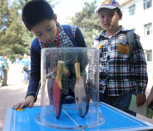 小學(xué)生在沈陽應(yīng)用生態(tài)研究所參觀“靜電乒乓”展示