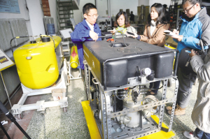 工作人員介紹新型冰下海洋環(huán)境監(jiān)測(cè)系統(tǒng) ■華商晨報(bào) 華商響網(wǎng)記者 張?jiān)妶?攝