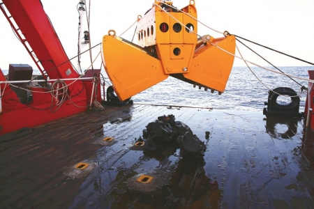 9日2時(shí)16分,電視抓斗下水。作為本航次第一抓,隊(duì)員們都期待能有所收獲和驚喜。經(jīng)過(guò)6次調(diào)整船的位置,4時(shí)47分,抓斗抓取樣品回船,共抓取到十余塊大小不一的巖石樣品。