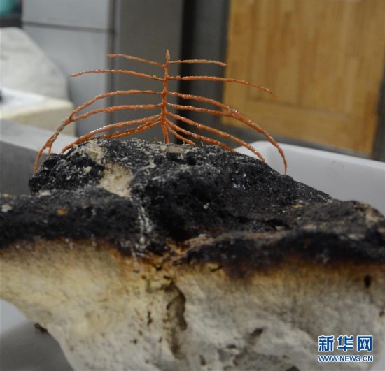 “發(fā)現(xiàn)”號(hào)采集到的一塊巖石上附著一株珊瑚(8月14日攝)