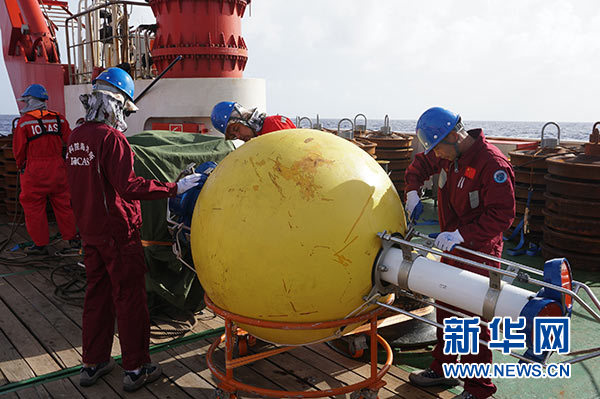 科考隊(duì)員在安裝潛標(biāo)的主浮球(2017年12月4日攝)。新華社發(fā)