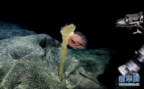 4月1日,“發(fā)現(xiàn)”號深海機(jī)器人在海山采集捕蠅草海葵樣品。新華社記者 張建松 攝