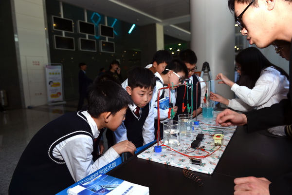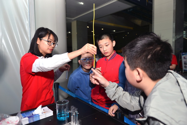 圖為科研人員向參觀學(xué)生門演示電解池中發(fā)生的電化學(xué)腐蝕現(xiàn)象。(圖 陶加攝)
