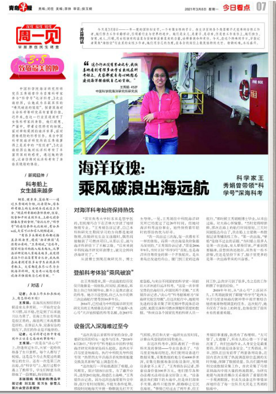 中國科學(xué)院海洋研究所研究員王秀娟曾作為首席科學(xué)家參與“科學(xué)號”遠(yuǎn)洋科考,3次出海經(jīng)歷,讓她成為名副其實(shí)的“乘風(fēng)破浪的姐姐”。探索深海對生命科學(xué)等研究具有重要價(jià)值,近年來,在這一行業(yè)里逐漸有了女性科學(xué)家的身影。她們聰慧、嚴(yán)謹(jǐn)中,帶著女性特有的細(xì)膩,面對神秘莫測的海洋世界,面對困難艱險(xiǎn)的科考任務(wù)。來自中國科學(xué)院海洋研究所的王秀娟算得上是其中的 “佼佼者”,3次出海經(jīng)歷讓她對遠(yuǎn)洋科考有了豐富而深刻的感受,通過她的講述,記者仿佛對遠(yuǎn)洋科考有了身臨其境般的體驗(yàn)。