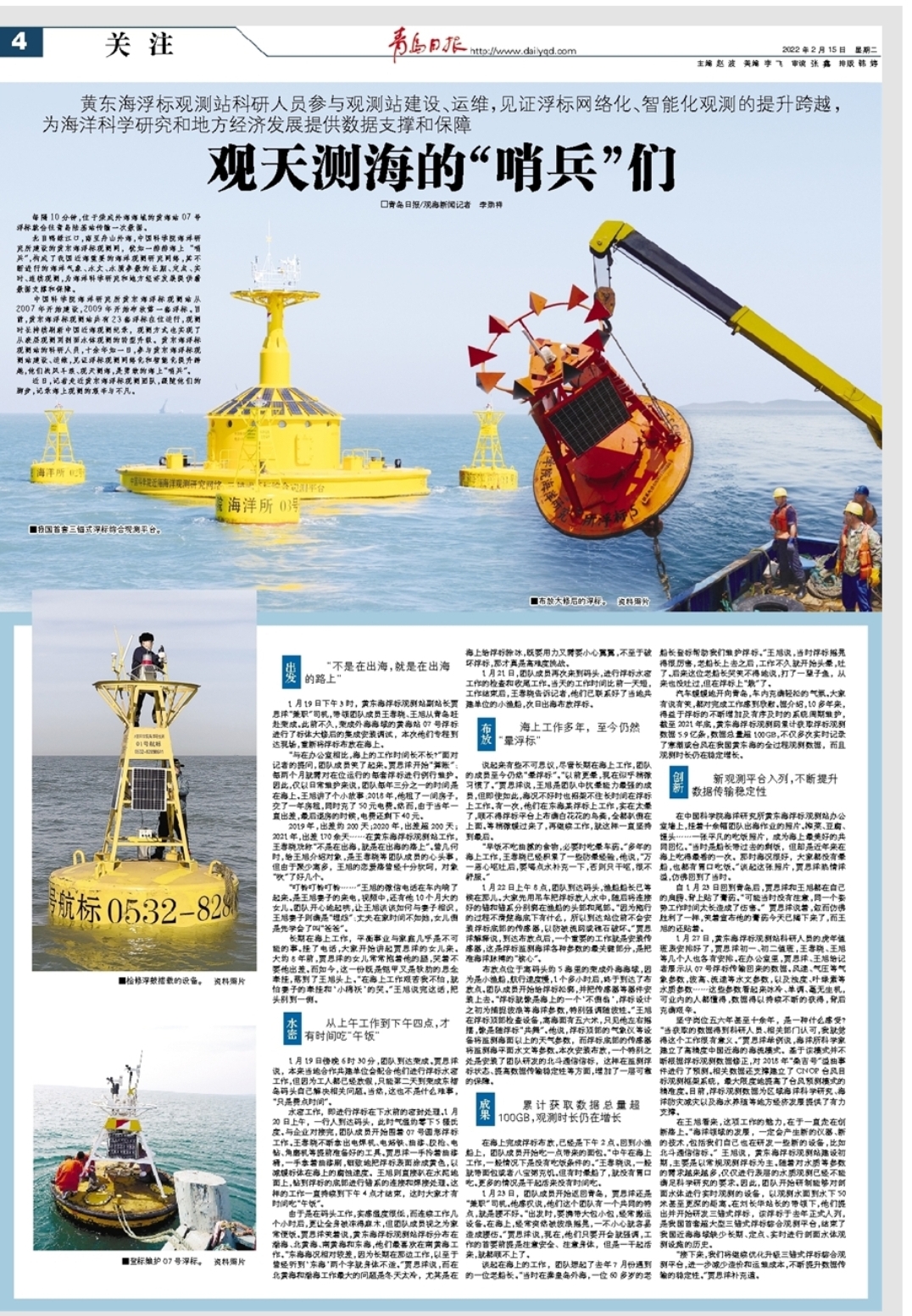 中國科學(xué)院海洋研究所黃東海浮標(biāo)觀測站從2007年開始建設(shè),2009年開始布放第一套浮標(biāo)。目前,黃東海浮標(biāo)觀測站共有23套浮標(biāo)在位運行,觀測時長持續(xù)刷新中國近海觀測紀(jì)錄,觀測方式也實現(xiàn)了從表層觀測到剖面水體觀測的轉(zhuǎn)型升級。黃東海浮標(biāo)觀測站的科研人員,十余年如一日,參與黃東海浮標(biāo)觀測站建設(shè)、運維,見證浮標(biāo)觀測網(wǎng)絡(luò)化和智能化提升跨越,他們戰(zhàn)風(fēng)斗浪、觀天測海,是勇敢的海上“哨兵”。