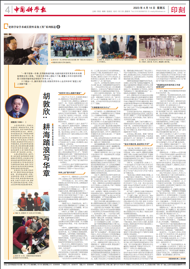 如今,胡敦欣已是桃李滿(mǎn)天下。當(dāng)年受他指導(dǎo)、幫助的年輕人已成長(zhǎng)為各領(lǐng)域的學(xué)術(shù)帶頭人,在各自領(lǐng)域?yàn)閲?guó)家海洋事業(yè)接力奮斗。