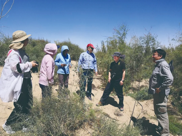 2018年,朱教君(右二)考察中國科學(xué)院策勒沙漠研究站固沙植被。沈陽生態(tài)所供圖