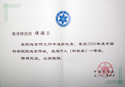日前,中科院院地合作局對(duì)2009年度中國科學(xué)院院地合作獎(jiǎng)先進(jìn)集體和先進(jìn)個(gè)人進(jìn)行表彰,中科院海洋所侯保榮院士榮獲2009年度中國科學(xué)院院地合作獎(jiǎng),先進(jìn)個(gè)人(科技類)一等獎(jiǎng)。