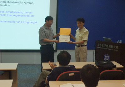 報(bào)告會(huì)上,馬小軍研究員代表該所及生物技術(shù)部向顧教授頒發(fā)了 “大連化物所高級(jí)伙伴研究員聘書”。 應(yīng)杜昱光研究員的邀請(qǐng),顧建國(guó)教授作為大連化物所“高級(jí)伙伴研究員”計(jì)劃合作研究員之一,將進(jìn)行為期一個(gè)月的合作研究。