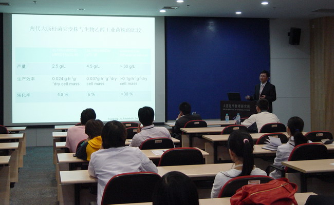 應(yīng)中科院大連化學(xué)物理研究所趙宗保研究員邀請,武漢大學(xué)劉天罡教授于日前到該所進(jìn)行學(xué)術(shù)交流。10月8日,劉天罡在生物樓學(xué)術(shù)報告廳做了題為“遺傳改造大腸桿菌直接生產(chǎn)先進(jìn)柴油”的學(xué)術(shù)報告,介紹了如何通過代謝工程策略改造大腸桿菌脂肪酸合成途徑,直接轉(zhuǎn)化甘油或葡萄糖等可再生原料產(chǎn)生先進(jìn)的燃料分子,以及建立和利用大腸桿菌Cell-free分析系統(tǒng),理性調(diào)控代謝途徑的工作。大家從報告中了解到液體生物燃料領(lǐng)域的一些國際發(fā)展趨勢,并就相關(guān)問題與劉教授進(jìn)行了深入討論。