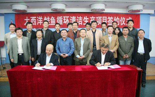 10月25日,“大西洋鮭魚封閉循環(huán)清潔生產(chǎn)項(xiàng)目”簽約儀式在海洋所舉行,山東東方海洋科技股份有限公司書記、副總經(jīng)理趙玉山、中科院海洋所張國范副所長等20人參加了簽約儀式。