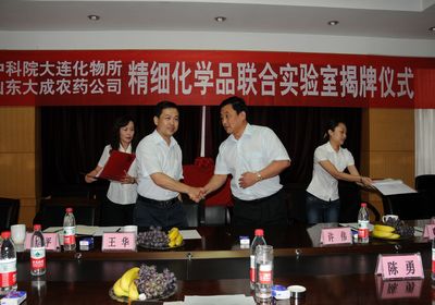 8月18日,“中國科學(xué)院大連化學(xué)物理研究所—山東大成農(nóng)藥股份有限公司‘精細(xì)化學(xué)品聯(lián)合實驗室’”簽約及揭牌儀式在山東淄博舉行。山東大成化工集團有限公司副總經(jīng)理兼山東大成農(nóng)藥股份有限公司副董事長許偉、山東大成化工集團有限公司副總經(jīng)理滕軍、大連化物所副所長王華、鄭卓研究員、胡向平副研究員等出席了儀式。