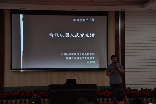 在報(bào)告中,齊俊桐以美國(guó)大片《變形金剛》的片段為導(dǎo)引,同時(shí)用大量的視頻介紹了多種智能機(jī)器人,例如爬壁機(jī)器人、蛇形機(jī)器人、滑翔式昆蟲(chóng)機(jī)器人等,讓孩子們大開(kāi)眼界,孩子們紛紛贊嘆,機(jī)器人太智能了,原來(lái)機(jī)器人不單純能唱歌、跳舞,還能做這么多事情;隨后對(duì)沈陽(yáng)自動(dòng)化所的水下機(jī)器人、旋翼飛行機(jī)器人、可變形機(jī)器人等進(jìn)行了精彩的介紹,并給同學(xué)們展示了這些機(jī)器人在生產(chǎn)生活、國(guó)家安全、公共安全、科學(xué)工程等方面的應(yīng)用。