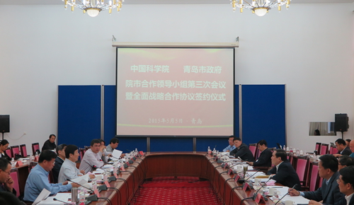 5月5日,中國(guó)科學(xué)院與青島市人民政府第二輪全面戰(zhàn)略合作協(xié)議在青島簽署,同時(shí)舉行了中科院與青島市的院市合作領(lǐng)導(dǎo)小組第三次會(huì)議,施爾畏副院長(zhǎng)、科技促進(jìn)發(fā)展局嚴(yán)慶局長(zhǎng)、沈陽(yáng)分院韓恩厚院長(zhǎng)、青島市張新起市長(zhǎng)等領(lǐng)導(dǎo),中科院各駐青機(jī)構(gòu)及山東中心負(fù)責(zé)人等60余人參會(huì)。青島市委常委、副市長(zhǎng)王廣正主持了會(huì)議。