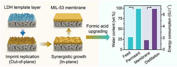 基于上述問題,研究團隊以氧化鋁載體表面生長的鋅—鋁雙金屬水滑石直立片層為模板,通過其在配體溶液中的化學自轉(zhuǎn)變過程制備出高度致密的MIL-53膜。研究發(fā)現(xiàn),MIL-53膜的生長分為兩個階段:在第一個階段,LDH作為鋁源供給型模板,可引導MIL-53晶體沿面外進行印跡復制型生長,約8個LDH六方晶格被同步替換為1個MIL-53正交晶格,形成膜的基礎(chǔ)架構(gòu);在第二個階段,隨著LDH模板犧牲,可動態(tài)調(diào)控氧化鋁載體中鋁源的可用性,引導MIL-53晶體沿面內(nèi)準正交生長,協(xié)同獲得高度致密的MIL-53膜。該膜呈現(xiàn)優(yōu)異的甲酸、乙酸脫水分離性能以及連續(xù)運行穩(wěn)定性。尤其重要的是,MIL-53膜可實現(xiàn)70 wt.%甲酸共沸物幾乎完全脫水(滲透物中水含量為98.9%),分離能耗與共沸精餾相比節(jié)省約77%。