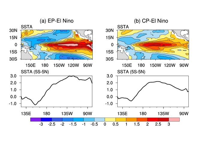 厄爾尼諾-南方濤動(ENSO)是氣候系統(tǒng)中最強(qiáng)的年際變率信號,對全球氣候和極端天氣具有重要影響。ENSO事件在空間模態(tài)上表現(xiàn)出明顯的多樣性特征,可分為中太型(CP)和東太型(EP)兩種類型,ENSO多樣性及其區(qū)域氣候影響差異是目前研究的熱點問題,但是ENSO多樣性的產(chǎn)生原因尚不明確。