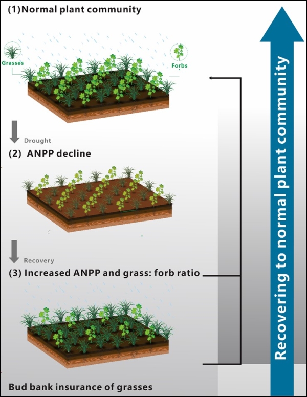 極端干旱對草原植物群落結(jié)構(gòu)和功能的影響不僅存在于極端干旱事件發(fā)生期間,還可能產(chǎn)生遺留效應,持續(xù)影響草原生態(tài)系統(tǒng)功能及其對環(huán)境變化的響應。揭示極端干旱的遺留效應及其驅(qū)動機制,對于認識和預測極端干旱對草原生態(tài)系統(tǒng)的影響,實現(xiàn)草原生產(chǎn)和生態(tài)功能維持與可持續(xù)利用至關(guān)重要,但目前該方面的研究尚十分缺乏。