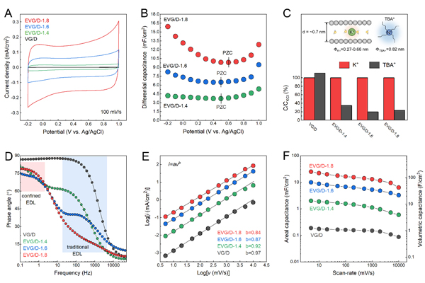 圖2. 層狀限域雙電層膨脹垂直石墨烯/金剛石薄膜電極的電化學(xué)行為:(A)CV曲線;(B)微分電容-電極電勢(shì)關(guān)系;(C)離子篩分效應(yīng);(D)EIS圖譜;(E-F)動(dòng)力學(xué)分析。
