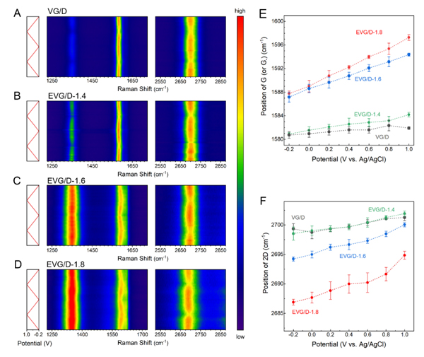圖3. 層狀限域雙電層膨脹垂直石墨烯/金剛石薄膜電極的原位電化學(xué)拉曼光譜:(A-D)原位電化學(xué)拉曼光譜;(E-F)拉曼特征演變幅度分析。