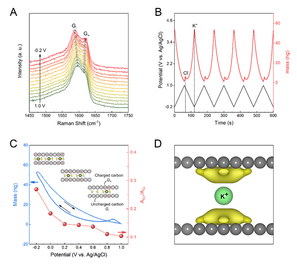 圖4. 層狀限域雙電層電容的儲(chǔ)能機(jī)理分析:(A)拉曼光譜中的G峰劈裂;(B)電化學(xué)石英晶體微天平分析;(C)電極質(zhì)量變化和拉曼特征變化的關(guān)聯(lián)性;(D)DFT-RISM計(jì)算獲得的圖像電荷分布。