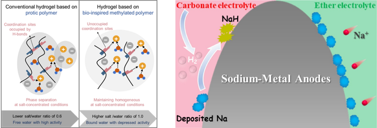 近期,固態(tài)能源系統(tǒng)技術(shù)中心在低成本鈉離子電池領(lǐng)域再獲重要進展,研究成果相繼發(fā)表在國際權(quán)威期刊《Angew. Chem. Int. Ed.》、《Adv. Energy Mater.》和《Energy Storage Mater.》上(圖1)。針對傳統(tǒng)水系電解質(zhì)中的自由水分子導(dǎo)致析氫、電極金屬離子溶出等問題,研究團隊通過甲基化調(diào)節(jié)氫鍵作用獲得了鈉離子電池超高濃聚合物電解質(zhì)新體系,鈉電池的循環(huán)穩(wěn)定性實現(xiàn)突破性提高(Angew. Chem. Int. Ed. 2023, e202311589)。同時,研究團隊發(fā)現(xiàn)鈉金屬負極SEI中NaH是影響電池性能的主要因素,是導(dǎo)致鈉電池失效的一種重要機制,NaH是由電池循環(huán)中產(chǎn)生的氫氣和已沉積的金屬鈉自發(fā)反應(yīng)生成的(Energy Storage Mater. 2023, 61, 102891)。研究團隊針對當(dāng)前鈉離子電池電解質(zhì)領(lǐng)域,進一步總結(jié)了當(dāng)前鈉離子電池電解質(zhì)中的基礎(chǔ)原理和研究進展,并對電解質(zhì)未來發(fā)展方向進行了展望(Adv. Energy Mater. 2023, 2301758)。