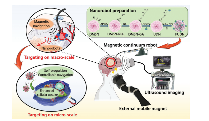腦膠質(zhì)瘤是嚴(yán)重危害人類健康的惡性腫瘤,患者中位生存期不到15個(gè)月,目前臨床采用的治療手段包括手術(shù)治療、放化療和靶向治療等。其中,靶向治療面臨著由于血腦屏障的阻隔使得大部分藥物分子不能夠進(jìn)入腦組織的難題。中國(guó)科學(xué)院沈陽(yáng)自動(dòng)化研究所科研團(tuán)隊(duì)與中國(guó)醫(yī)科大學(xué)附屬盛京醫(yī)院合作,研制了一套子母式微納米機(jī)器人系統(tǒng),可經(jīng)顱骨微創(chuàng)通道進(jìn)入顱內(nèi),越過血腦屏障抵達(dá)膠質(zhì)瘤部位,將藥物精準(zhǔn)遞送到膠質(zhì)瘤病灶。該研究以Dual-Responsive Nanorobot-Based Marsupial Robotic System for Intracranial Cross-Scale Targeting Drug Delivery為題,發(fā)表在最新一期材料領(lǐng)域國(guó)際頂刊《先進(jìn)材料》(影響因子29.4)。
