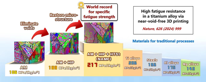 近期,中國科學(xué)院金屬研究所材料疲勞與斷裂團(tuán)隊(duì)帶頭人張哲峰研究員在前期疲勞損傷機(jī)制和疲勞預(yù)測理論指導(dǎo)下,與輕質(zhì)高強(qiáng)材料研究部楊銳研究員團(tuán)隊(duì)開展合作,在3D打印鈦合金抗疲勞設(shè)計(jì)制備方面取得了突破性進(jìn)展,制備出具有優(yōu)異疲勞性能的3D打印鈦合金材料。該項(xiàng)研究成果于2024年2月29日以題為“High fatigue resistance in a titanium alloy via near void-free 3D printing”發(fā)表在Nature雜志上,金屬所博士研究生曲展為論文第一作者,張振軍研究員、美國加州大學(xué)伯克利分校Robert O. Ritchie教授、張哲峰研究員為論文通訊作者。
