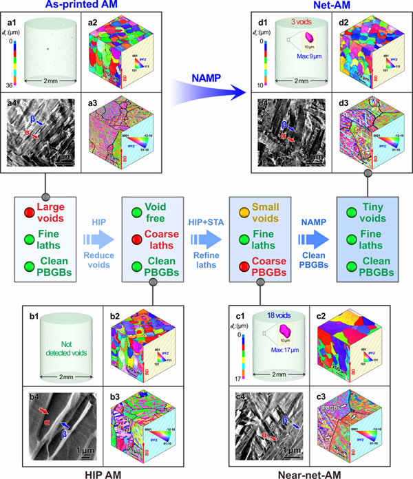 在文中,研究人員首次明確提出:理想狀態(tài)下3D打印技術(shù)直接制備出的鈦合金組織本身(稱為Net-AM組織)應(yīng)具有天然優(yōu)異的疲勞性能,而打印過程中產(chǎn)生的氣孔等缺陷掩蓋了其自身組織抗疲勞的優(yōu)點(diǎn),導(dǎo)致實(shí)際測量的3D打印材料疲勞性能大幅降低。因此,提升3D打印材料疲勞性能的關(guān)鍵在于消除打印氣孔的同時(shí),盡可能保留原始打印的組織狀態(tài)。然而,目前消除氣孔的工藝往往伴隨組織粗化,而細(xì)化組織的處理又會(huì)帶來氣孔復(fù)現(xiàn),甚至引發(fā)晶界 相富集等新的不利因素,可謂進(jìn)退兩難。幸運(yùn)的是,研究人員在Ti-6Al-4V合金中首次發(fā)現(xiàn),高溫下3D打印態(tài)組織的晶界遷移及氣孔長大與相轉(zhuǎn)變過程表現(xiàn)出異步的特性;這意味著,存在一個(gè)寶貴的熱處理工藝窗口,既可實(shí)現(xiàn)板條組織細(xì)化,又能有效抑制晶界 相富集及氣孔復(fù)現(xiàn)。為此,研究人員巧妙地利用了這一工藝窗口,發(fā)明了缺陷與組織分步調(diào)控的NAMP新工藝(Net-Additive Manufacturing Process)(圖1),最終制備出幾乎無氣孔的近Net-AM Ti-6Al-4V合金。