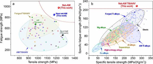 圖3. 本研究工作制備的Net-AM組織鈦合金的疲勞性能(R=0.1):(a) Net-AM組織鈦合金拉-拉疲勞強(qiáng)度與增材和鍛造鈦合金疲勞強(qiáng)度對(duì)比;(b)Net-AM組織鈦合金與其他材料的比疲勞強(qiáng)度對(duì)比。Net-AM組織鈦合金不僅在鈦合金中具有最高的疲勞強(qiáng)度,而且在所有材料中表現(xiàn)出最高的比疲勞強(qiáng)度。