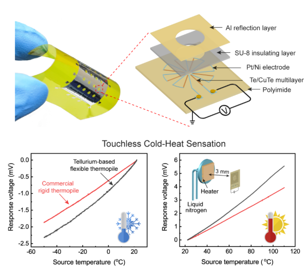 近日,中國科學(xué)院大連化學(xué)物理研究所催化基礎(chǔ)國家重點(diǎn)實(shí)驗(yàn)室熱電材料與器件研究組研究員姜鵬、副研究員陸曉偉、中國科學(xué)院院士包信和團(tuán)隊(duì)開發(fā)了柔性、可穿戴長(zhǎng)波紅外光熱電探測(cè)器,并將其用于電子皮膚非接觸溫度感知。