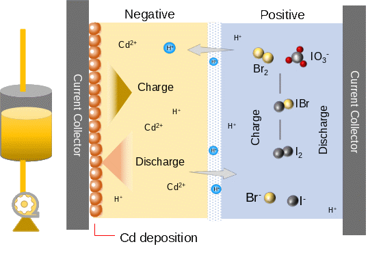 為了提高水系電池的能量密度,本工作中,李先鋒團隊使用碘離子(I-)和溴離子(Br-)混合鹵素溶液作為電解液,構(gòu)建了碘離子(I-)到碘單質(zhì)(I2)進而到碘酸根(IO3-)的多電子轉(zhuǎn)移反應(yīng)。充電過程中,碘離子在正極生成碘酸根,伴隨生成的氫離子從正極傳導(dǎo)到負(fù)極一側(cè);放電過程中,氫離子從負(fù)極向正極傳導(dǎo),碘酸根被還原為碘離子。團隊利用在充放電過程中形成的溴化物中間態(tài),優(yōu)化了反應(yīng)路徑,有效提高了電化學(xué)反應(yīng)的活性和可逆性,所開發(fā)的多電子轉(zhuǎn)移正極比容量達(dá) 840安時/升。該正極與金屬鎘組成全電池,基于正極側(cè)的能量密度超過1200瓦時/升。