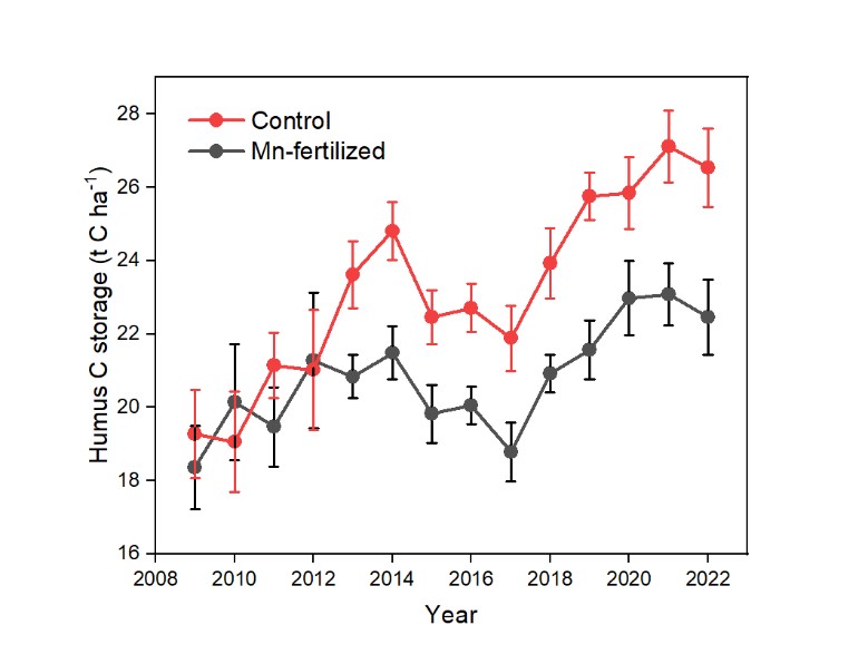 研究揭示了外生菌根真菌通過調(diào)控土壤錳元素循環(huán)促進(jìn)了落葉松人工林腐殖質(zhì)層碳庫積累的新機(jī)制。北方森林(Boreal forests)儲存了全球陸地生態(tài)系統(tǒng)24%以上的碳庫,其中大約64%儲存于地下。其儲存的碳庫主要位于腐殖質(zhì)層中,包含正在分解的凋落物和其它有機(jī)物質(zhì)。Agaricomycetes是高緯度地區(qū)落葉松人工林土壤中普通存在的一類外生菌根真菌,Agaricomycetes特異性產(chǎn)生的錳過氧化物酶通過驅(qū)動錳氧化還原循環(huán),可以把腐殖質(zhì)層中可利用的二價錳離子(Mn2+)轉(zhuǎn)化為活性三價錳離子(Mn3+),該活性三價錳離子與真菌分泌的草酸類螯合劑形成化合物,可穿透木質(zhì)素和木質(zhì)素類化合物的酚類結(jié)構(gòu),從而調(diào)控有機(jī)質(zhì)分解和腐殖質(zhì)層碳庫積累?;诖思僭O(shè),研究團(tuán)隊(duì)在大興安嶺寒溫帶落葉松人工林設(shè)置了長達(dá)14年的錳添加實(shí)驗(yàn)(圖3),發(fā)現(xiàn)錳添加處理進(jìn)行到第5年后,顯著改變了外生菌根真菌的群落組成并增加了腐殖層碳庫容量。本研究解析到的錳添加的滯后影響,可能是由于外生菌根真菌需要一定周期后才能適應(yīng)錳有效性的增加和土壤環(huán)境的變化。