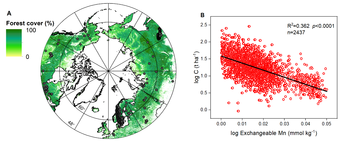 對我國大興安嶺落葉松人工林318個樣點(diǎn)腐殖層碳庫的調(diào)查研究,也表明腐殖質(zhì)層可交換態(tài)錳含量是調(diào)控碳庫的重要調(diào)控因子(r2=0.20)。同時,結(jié)合瑞典國家森林土壤清查、瑞典國家森林清查數(shù)據(jù)以及數(shù)據(jù)整合分析的手段,建立了覆蓋全球北方森林范圍的2437個樣點(diǎn)的腐殖質(zhì)層碳儲量數(shù)據(jù),發(fā)現(xiàn)可交換態(tài)錳含量可以解釋北方森林腐殖層碳庫36%的變化(圖4)。研究結(jié)果與長期錳添加實(shí)驗(yàn)相互驗(yàn)證和補(bǔ)充。