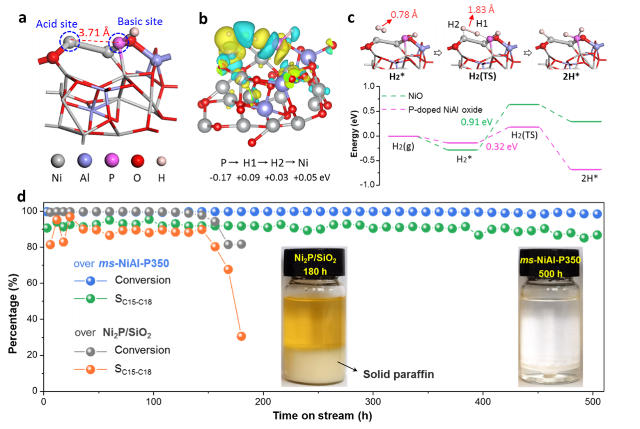 此外,面向?qū)嶋H工業(yè)應(yīng)用,研究組進(jìn)行了催化劑的批量制備及成型,并驗(yàn)證了成型催化劑在1000 h連續(xù)流反應(yīng)中仍然具有優(yōu)異的活性及穩(wěn)定性。該FLPs催化劑在催化活性、穩(wěn)定性、成本、環(huán)保屬性等方面均具優(yōu)勢(shì),有望替代商用硫化態(tài)催化劑,為綠色柴油產(chǎn)業(yè)提供更綠色、更高效的工藝方案。相關(guān)研究成果以“Frustrated Lewis pair catalyst realizes efficient green diesel production”為題發(fā)表于《Nature Communications》期刊上,這也是Nature系列期刊上首篇關(guān)于綠色柴油合成的研究型論文。